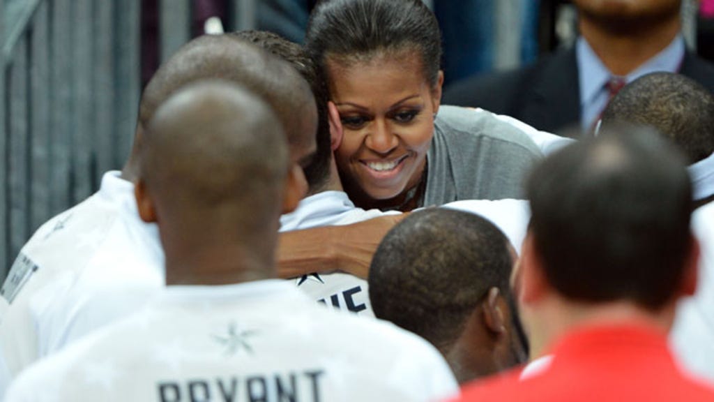 First Lady Michelle Obama was dubbed "the First Fan" at the U.S. men's national basketball team's game on Sunday, giving every U.S. player a hug after their win over France.