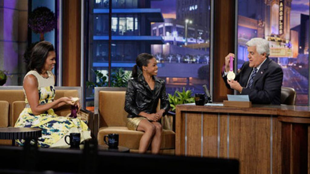 The newly crowned Olympic gold medalist dropped by The Tonight Show with Jay Leno to chat about her recent triumphs in London, and when talk came of how Gabby celebrated her big win, the young athlete revealed her first stop shortly after was to "splurge" on an Egg McMuffin at the golden arches of McDonalds, which didn't elicit a very favorable response from Michelle Obama.