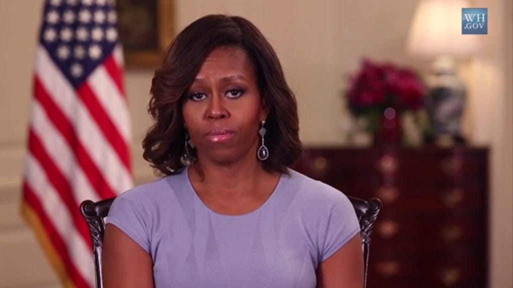 In a special Mother's Day message to the nation, First Lady Michelle Obama addressed the kidnapping of nearly 300 schoolgirls in Nigeria, saying that she and President Barack Obama join "millions of people around the world" who are "outraged and heartbroken" over the April 15 abduction of the girls from their dormitory.