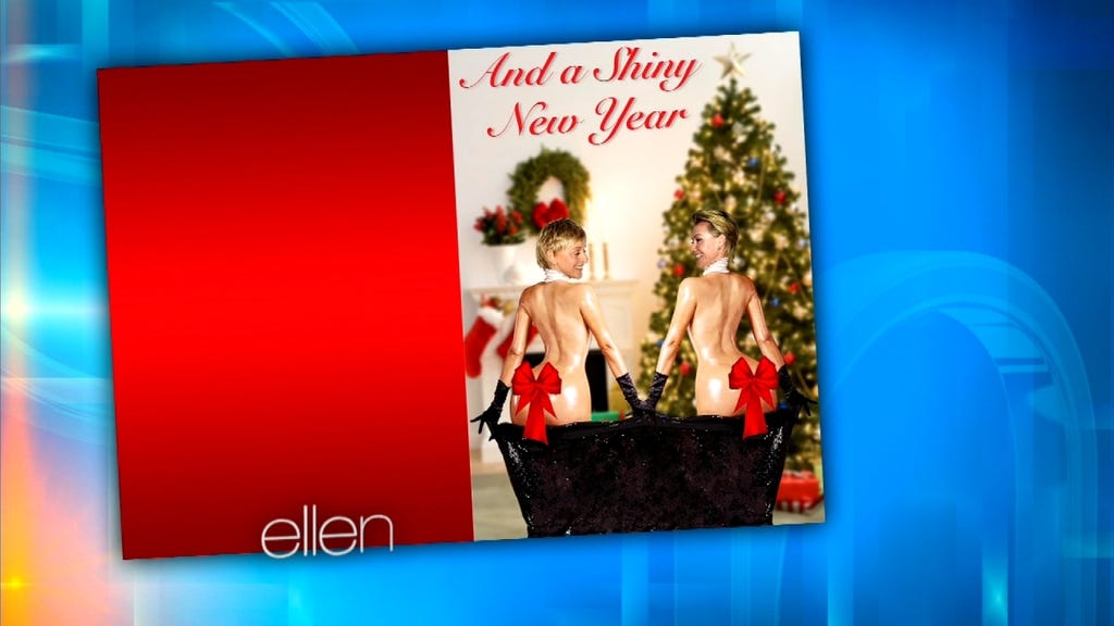 The card features Ellen and wife Portia De Rossi copying Kim Kardashian’s naked cover shot for Paper. “Shiny New Year.” Get it? Like shiny new rear? Very clever, Ellen. Veeery clever.