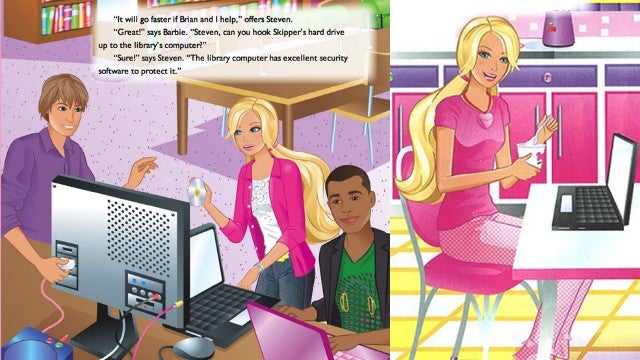 In one of her newest professions, Barbie decided to become a computer engineer! But in the book Barbie: I Can Be a Computer Engineer, she mostly just infects computers with viruses and can’t fix anything without the help of her male coworkers. The Internet saw fit to re-caption pages from the book and turn her into the superior #FeministHackerBarbie.