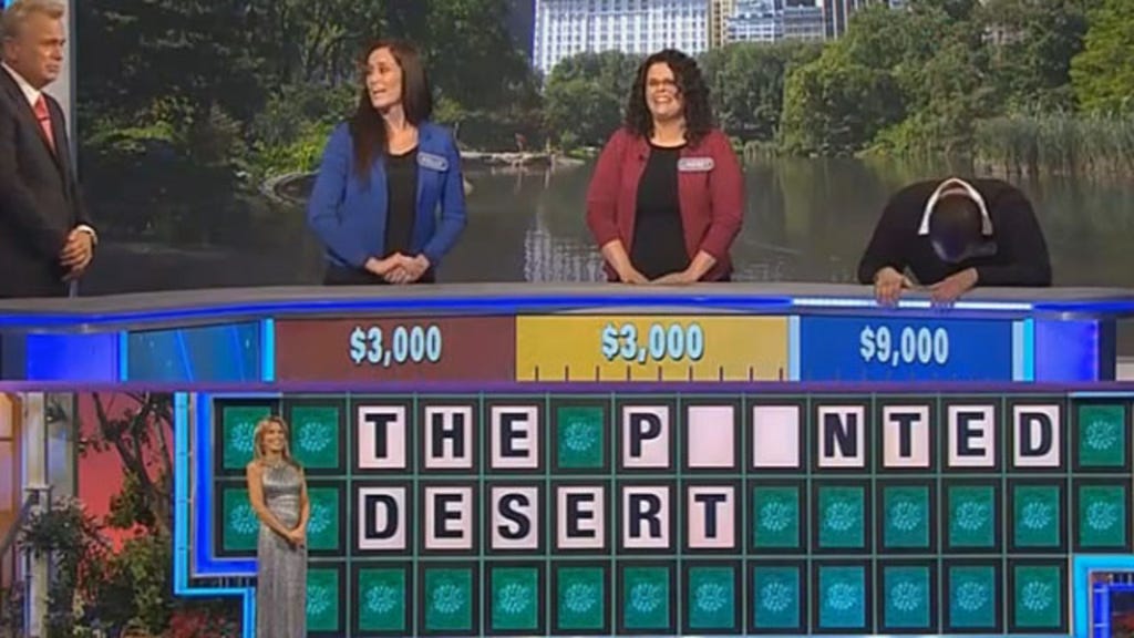 After the third contestant Kelly guessed the correct answer - "the painted desert" - Sajak was still in disbelief over James' multiple attempts. He joked, "I was just going to give him 'Pointed Desert.' He was so insistent!"