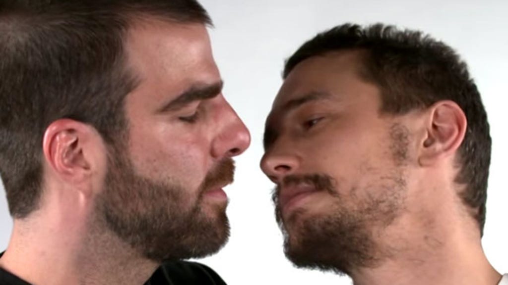 The video begins with Franco looking deep into Quinto's eyes before going in for a kiss. At the end of the clip (about 2 minutes in), the men finally lock lips while being showered with popcorn and laughing.