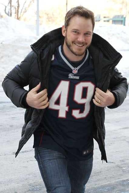 Pratt also had to wear a custom New England Patriots jersey for the duration of his Boston visit, which as you can see, he did with a smile.