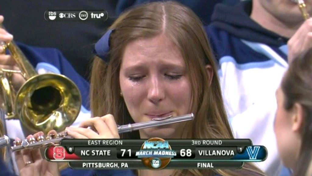 In the second round of NCAA's March Madness tournament, Villanova suffered a devastating upset to North Carolina State, losing 68-71. But the only thing anyone remembers from the game is this girl in the Villanova band, caught on live TV crying while playing her piccolo: