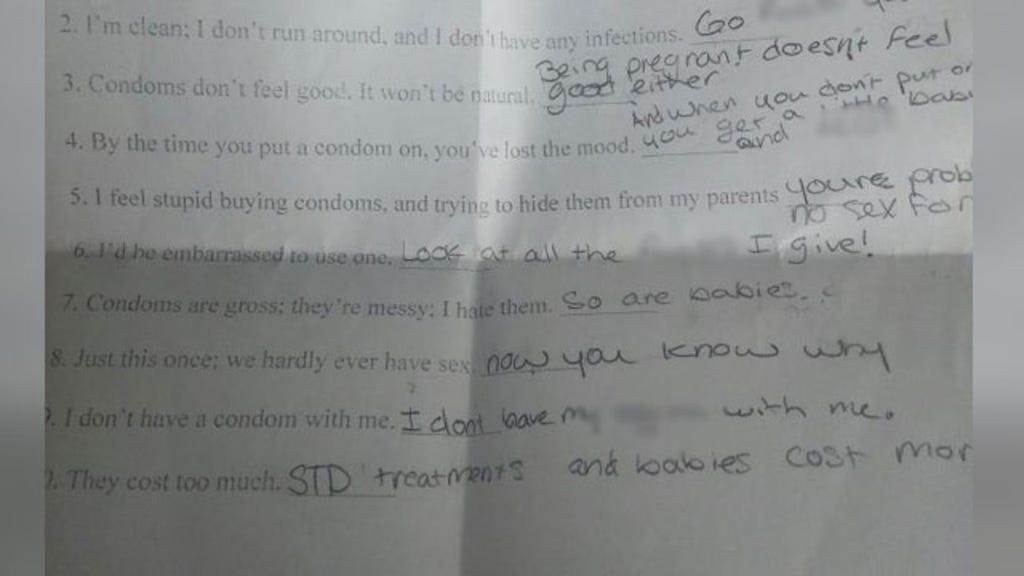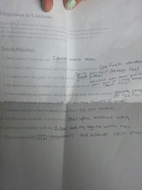 The instructions were to match responses to some common objections to using condoms during sex. While Mariah didn't exactly follow instructions (she writes in her own responses), there's something so cool about how boldly she answered. Here are some of our favorite objections and responses.