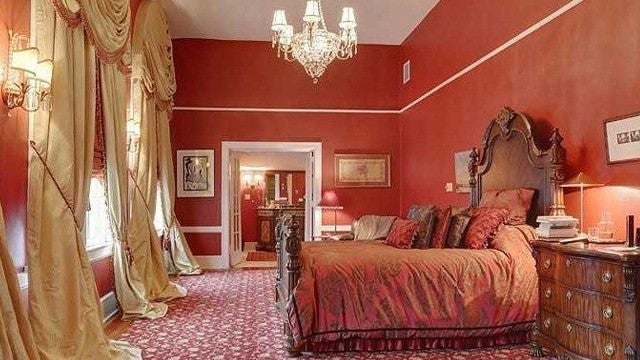 The home has hardwood floors and chandeliers, and one of the seven bedrooms is a red room (and we're not talking Fifty Shades of Grey here).