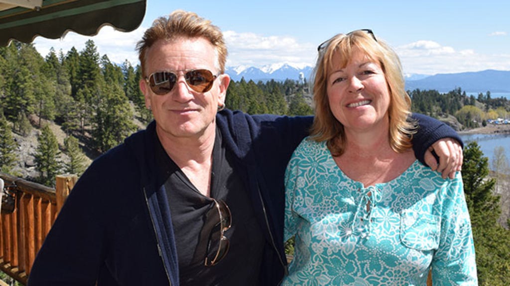 During his brief visit, Bono, 55, sat down on the owner's deck overlooking the beautiful Flathead Lake and Rocky Mountains, had his cup of coffee and a bite to eat and told his host this was his first time there and thought it was a beautiful state.