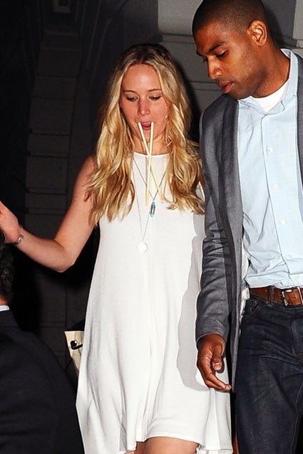 The Hunger Games leading lady made quite the scene on Wednesday when she stepped out of Nobu restaurant wearing her chopsticks as walrus tusks.