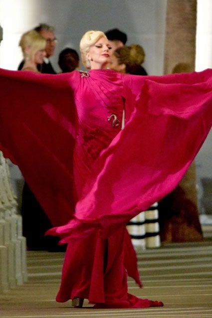 Gaga was snapped on set wearing a lavish magenta gown, complete with a floor-length cape and two jewel-encrusted serpent broaches. Her platinum locks were twisted into an elegant up-do, and her makeup featured a fierce cat-eye and dark fuchsia lipstick.