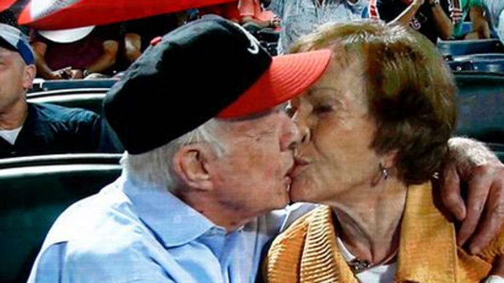 Former President Jimmy Carter caught on Kiss Cam at @Braves game: http://t.co/jAWC9LH3Db (photo from Braves) pic.twitter.com/VutpHTrDw6