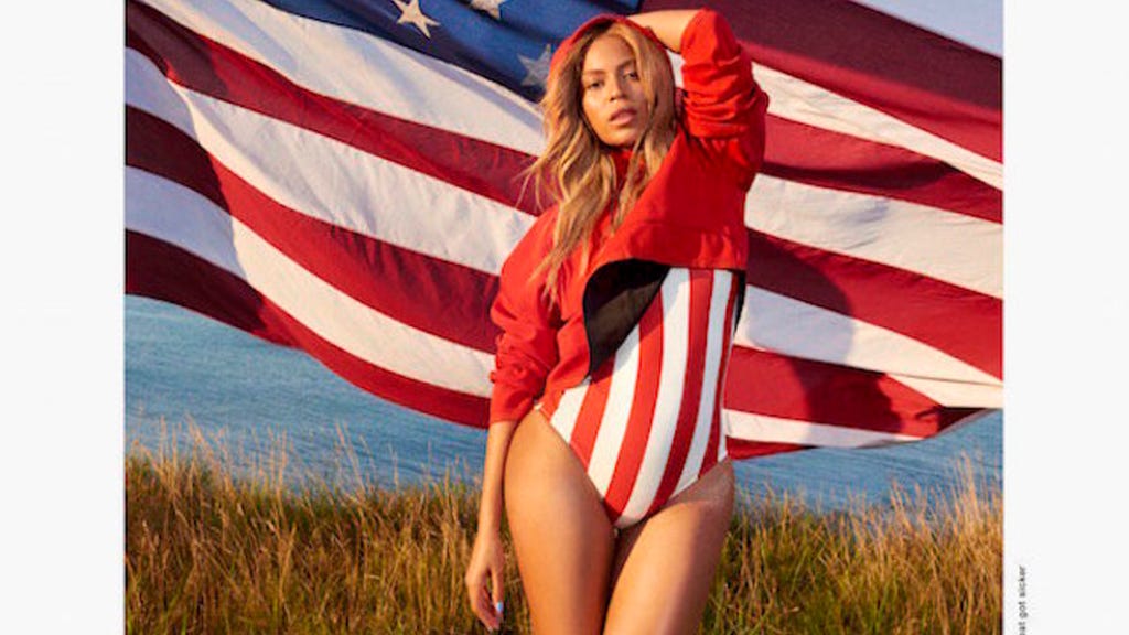 The 34-year-old goes patriotic in a gorgeous cover shot for Beat magazine, donning a red and white striped one-piece and a red hoodie with the star spangled American flag flowing behind her. Shot in the Hamptons by Ryan McGinley, the picture-perfect image also shows just a hint of water in the background.