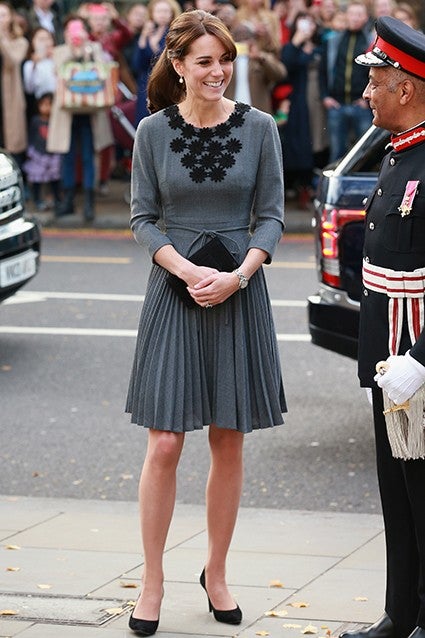 Kate looked casual and chic in this Orla Kiely gray pleated dress with a black embellished neckline while stepping out solo to meet children from Chance UK's Early Intervention Program at Islington Town Hall on Tuesday. But this isn't the first time we've seen her wear this exact dress. The 33-year-old royal also wore it to visit the Dulwich Picture Gallery in South London in 2012.