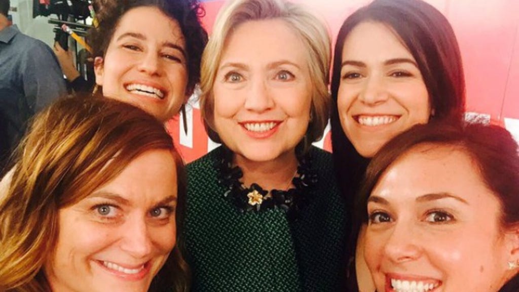 Crying red white & blue tears.Hanging w/kween @HillaryClinton on the set of season 3! #Hillary2016 #AmyPoehlerSelfie pic.twitter.com/WaFA13uQxS