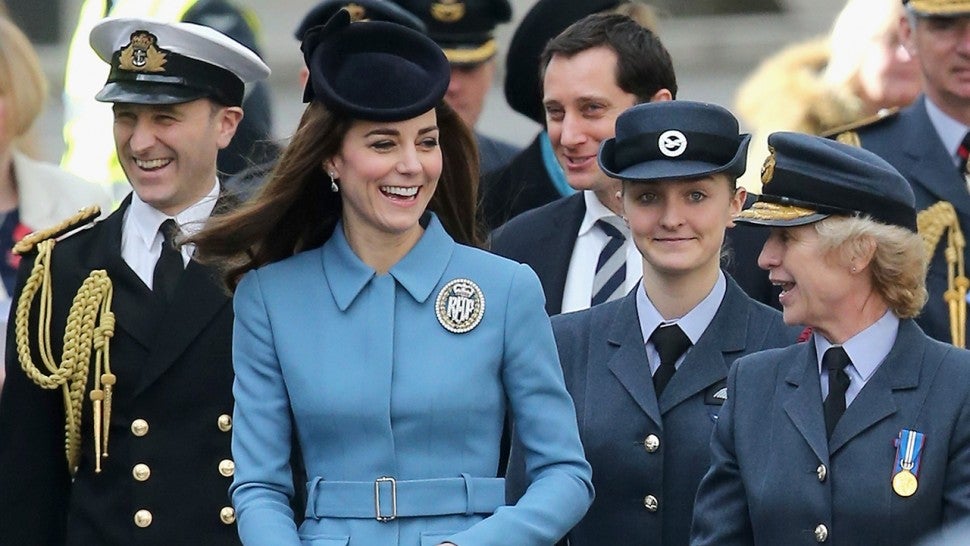 All eyes were on the Duchess, 34, who donned a long, robin egg's blue Alexander McQueen coat, which she paired with navy blue suede heels and a hat from Lock & Co. Attached to her coat was a large must-see Dacre diamond and Ruby RAF brooch. The pin is the highest honor a female cadet can receive, and while Kate was not an Air Cadet herself, she was still deserving of the honor, which was gifted to her following her appointment with the organization in December.