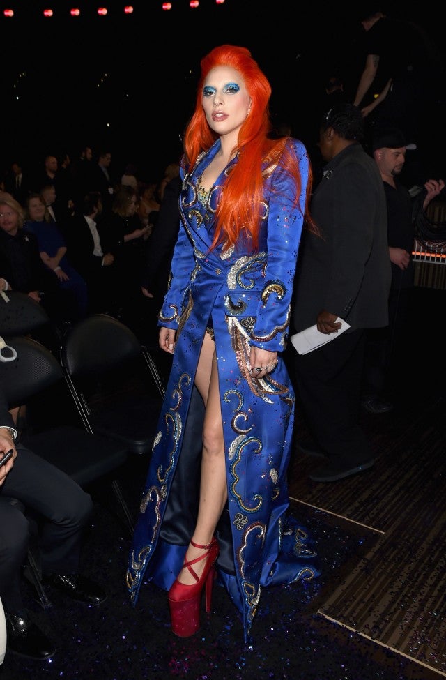 The outfit is certainly fitting for Gaga's tribute to Bowie this evening. The "Space Oddity" singer, who died on Jan. 10, was famous for his androgynous fashion and glam styling.