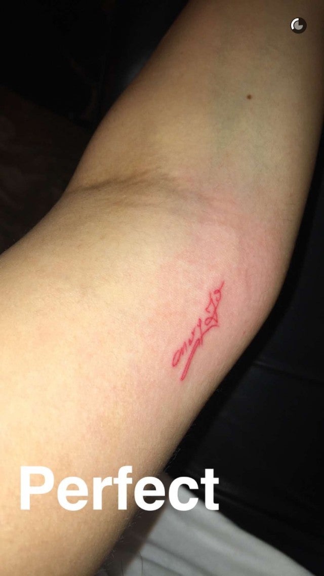 Still extremely proud of her "Mary Jo" tattoo, which is located on her forearm, the star once again showed off that sweet body art from earlier this year via Snapchat, writing “perfect” over the image after JonBoy gave it a touch-up.