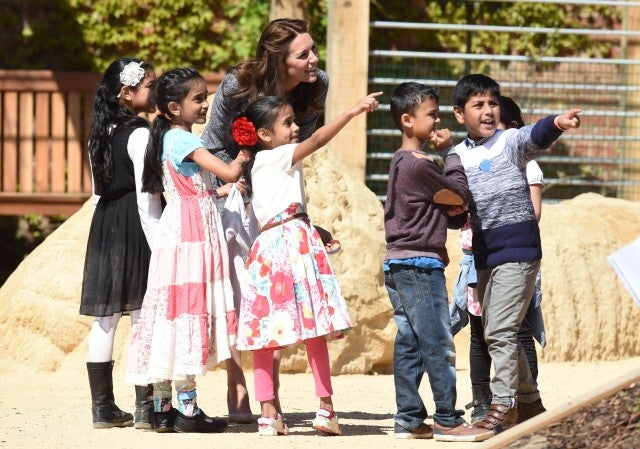 Rocking a recycled twill jacquard swing coat from the 2014 Michael Kors collection, the Duchess of Cambridge officially opened the Magic Garden playground at Hampton Court Palace in London on Wednesday. During her visit, she chatted and laughed with a lucky group of school children who got to play on it before anyone else.