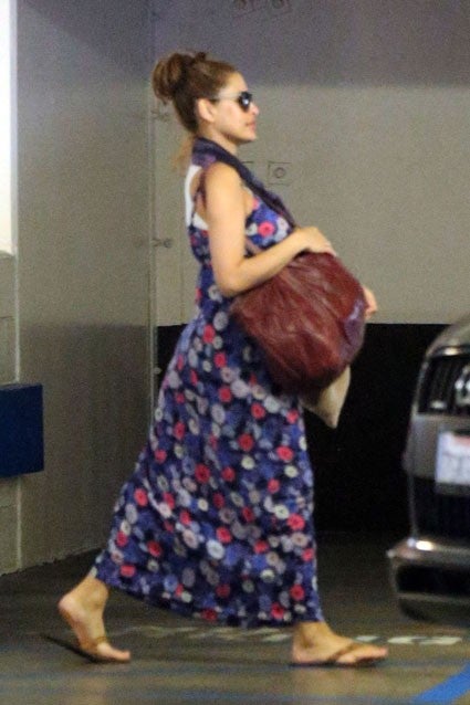 Mendes was spotted covering up her baby bump two weeks before giving birth. The 42-year-old actress was snapped while leaving a medical building in Los Angeles, wearing a floral maxi dress and toting a big purse.