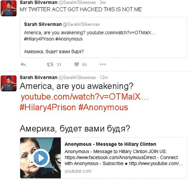 Sarah Silverman's Twitter gets hacked with anti-Hillary Clinton message.