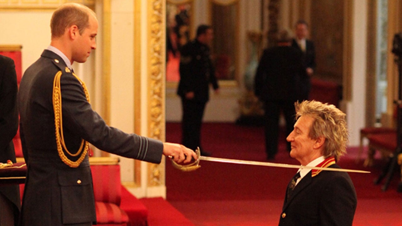 The 71-year-old singer was knighted by Prince William on Tuesday at Buckingham Palace in recognition of his services to music and charity, and couldn't look happier to receive the honor. Dressed in tartan trousers and a black coat, Stewart knelt as Prince William held a sword over his left shoulder.