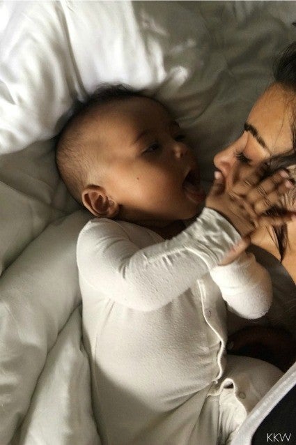 Nearly three months after Saint was born, Kim took to her social media channels to share the first official pic of her son. "Today is my dad's birthday. I know there's nothing more in the world he would have wanted than to meet his grandchildren. So I wanted to share this pic of Saint with you all,” she wrote with the image of the little guy, decked out in all white, fast asleep with his arms up in the air.