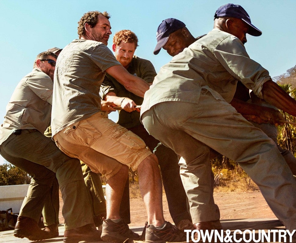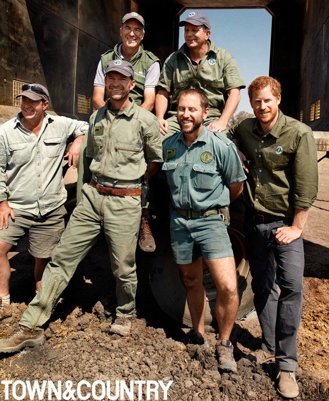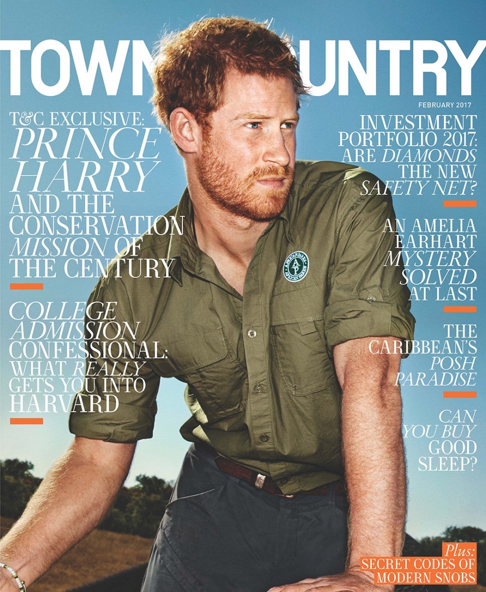 The 32-year-old royal covers Town & Country's February issue, looking rugged in a simple green button-up shirt and faded pants. Harry invites the magazine along as he rescued elephants in Africa with African Parks, a non-profit conservation organization that aims to save wildlife, restore landscapes and ensure sustainable livelihoods for local communities.