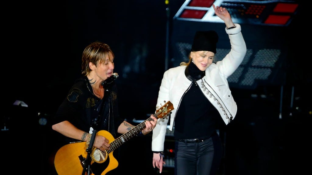 Nicole Kidman surprised Keith Urban on stage as the singer headlined Jack Daniel's Music City Midnight: New Year's Eve in Nashville, Tennessee on Saturday. The father of two put on an incredible tribute to artists lost in 2016, including Prince, David Bowie, Merle Haggard, Leonard Cohen and Glenn Frey -- with Kidman joining her husband on stage and dancing in the background.