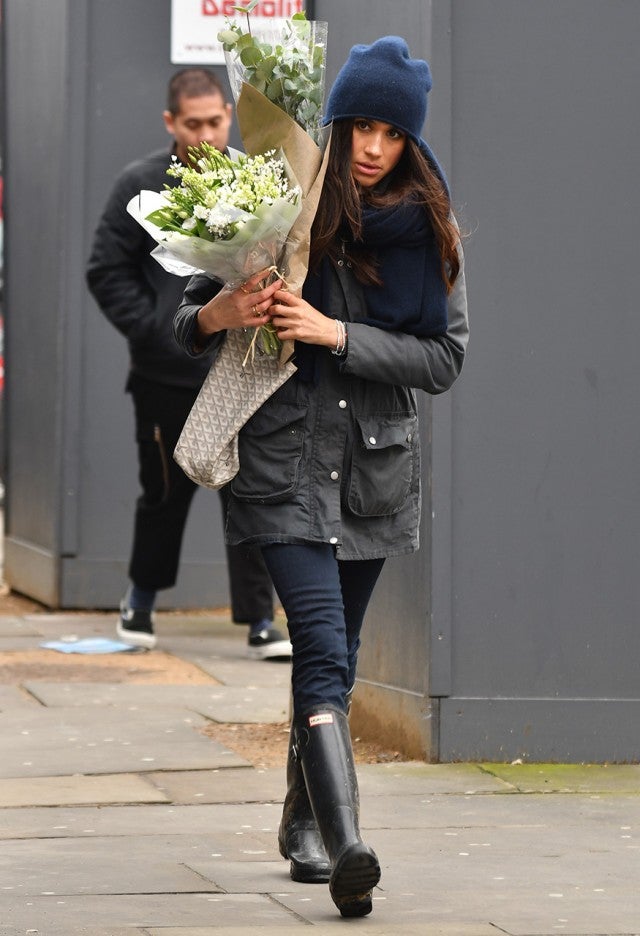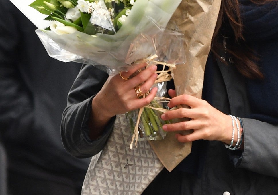 On Sunday, the 35-year-old actress was snapped carrying flowers from shops near Kensington Palace, but it was her jewelry that had people buzzing. Meghan wore a gold ring with the letter H on it on her right hand, presumably alluding to her relationship with Harry.
