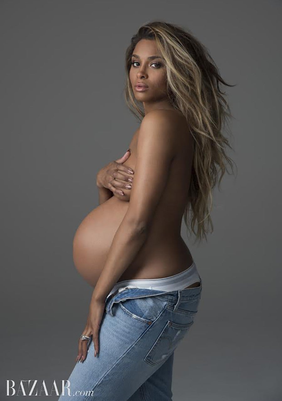 The 31-year-old singer flaunted her bare baby bump for a photo shoot for Harper's Bazaar, going topless in one stunning shot.
