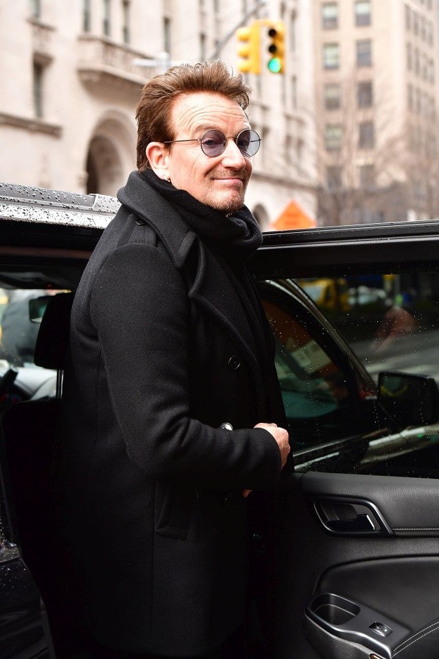 Bono also opted for black, sporting a scarf and peacoat with his signature purple-tinted, round-framed sunnies.