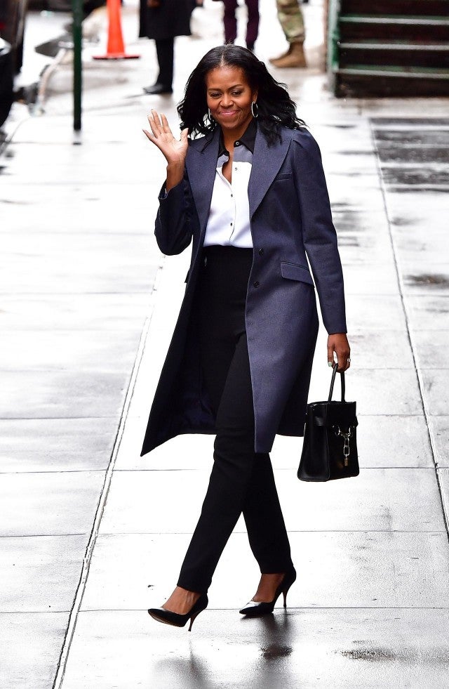 His wife looked equally cheery, clad in high-waisted black slacks, a chic blouse and blue coat. She completed the look with pretty statement earrings and black pointed toe heels.