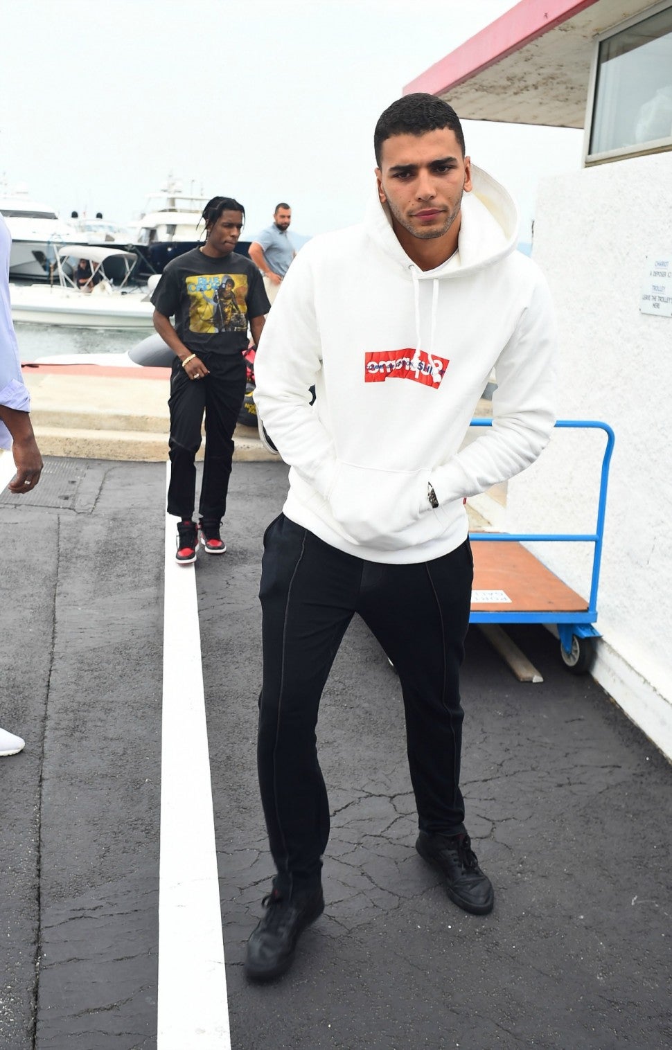 Kardashian's beau, Bendjima, 24, followed in a white hoodie, while Jenner's rumored boyfriend, A$AP Rocky, 28, sported a graphic tee and sneakers.