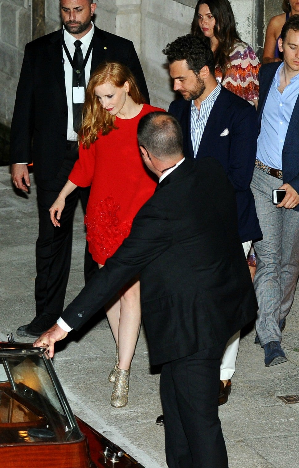 Just one day before the wedding, Chastain, sporting a stunning red dress, and Passi de Preposulo, stepped out for a pre-wedding party in Venice.
