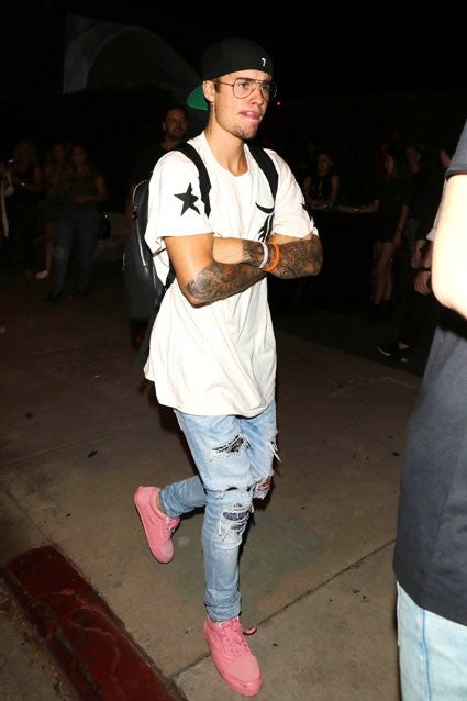 On Thursday night, the "Sorry" singer showed up to support the launch of Karla Welch's new collection of Hanes x karla T-shirts, which are inspired by the original custom tee she made for Bieber's Believe tour, in Los Angeles, California. Bieber looked casual and trendy in a pair of ripped denim, pink sneakers, a black backwards baseball cap and a white T-shirt with stars printed on the sleeves. He also sported some large eyeglasses and a bit of stubble.