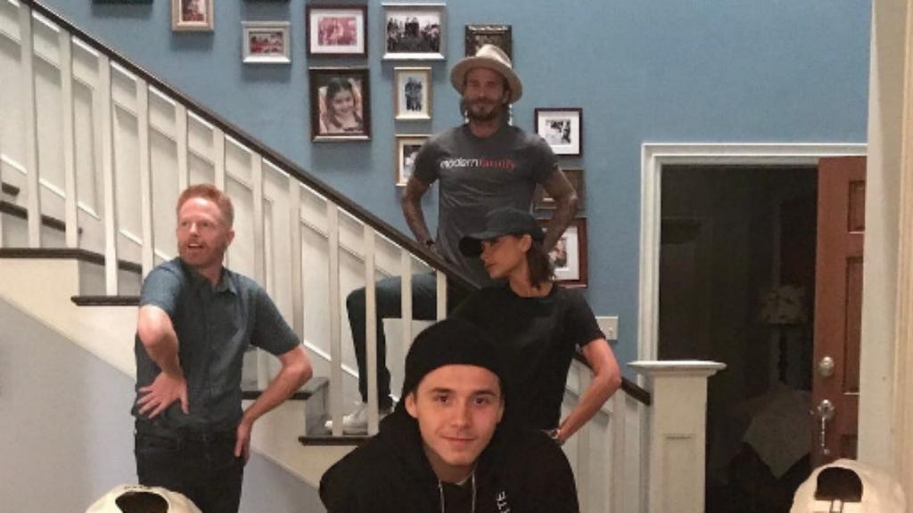 Looks like there's a new modern family in the building. On Thursday, Victoria Beckham shared a cute pic of herself with husband David Beckham, her kids -- sons Brooklyn, Romeo, Cruz and daughter Harper -- and Jesse Tyler Ferguson visiting the Modern Family set.