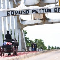 Civil rights icon John Lewis' body is being carried across the Edmund Pettus Bridge in Selma, Alabama, on Sunday.