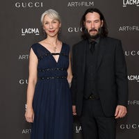 Grant wore a plunging, navy blue gown, as she was snapped adoringly gazing at Reeves in his black suit.