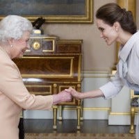 Angelina Jolie greeted her Majesty Friday morning, and entered into damehood.
