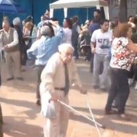 In a viral video, this elderly man throws away his crutches to feel the beat.