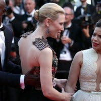 A man jumped and hid under How To Train Your Dragon 2 star America Ferrera's white gown during the film's premiere, causing commotion as security quickly dove in and dragged the prankster away.