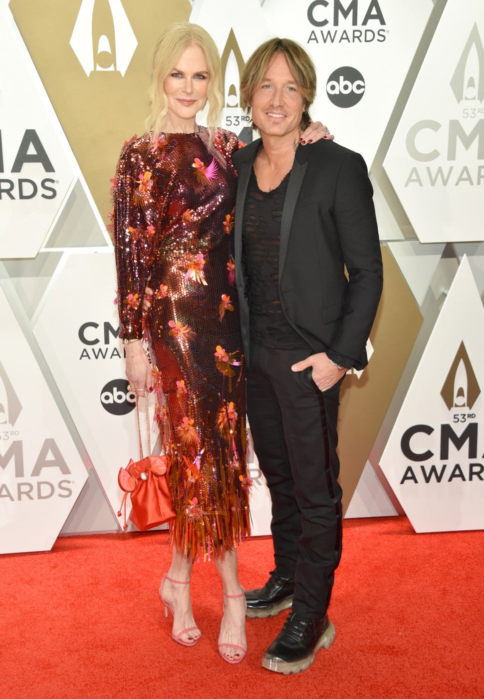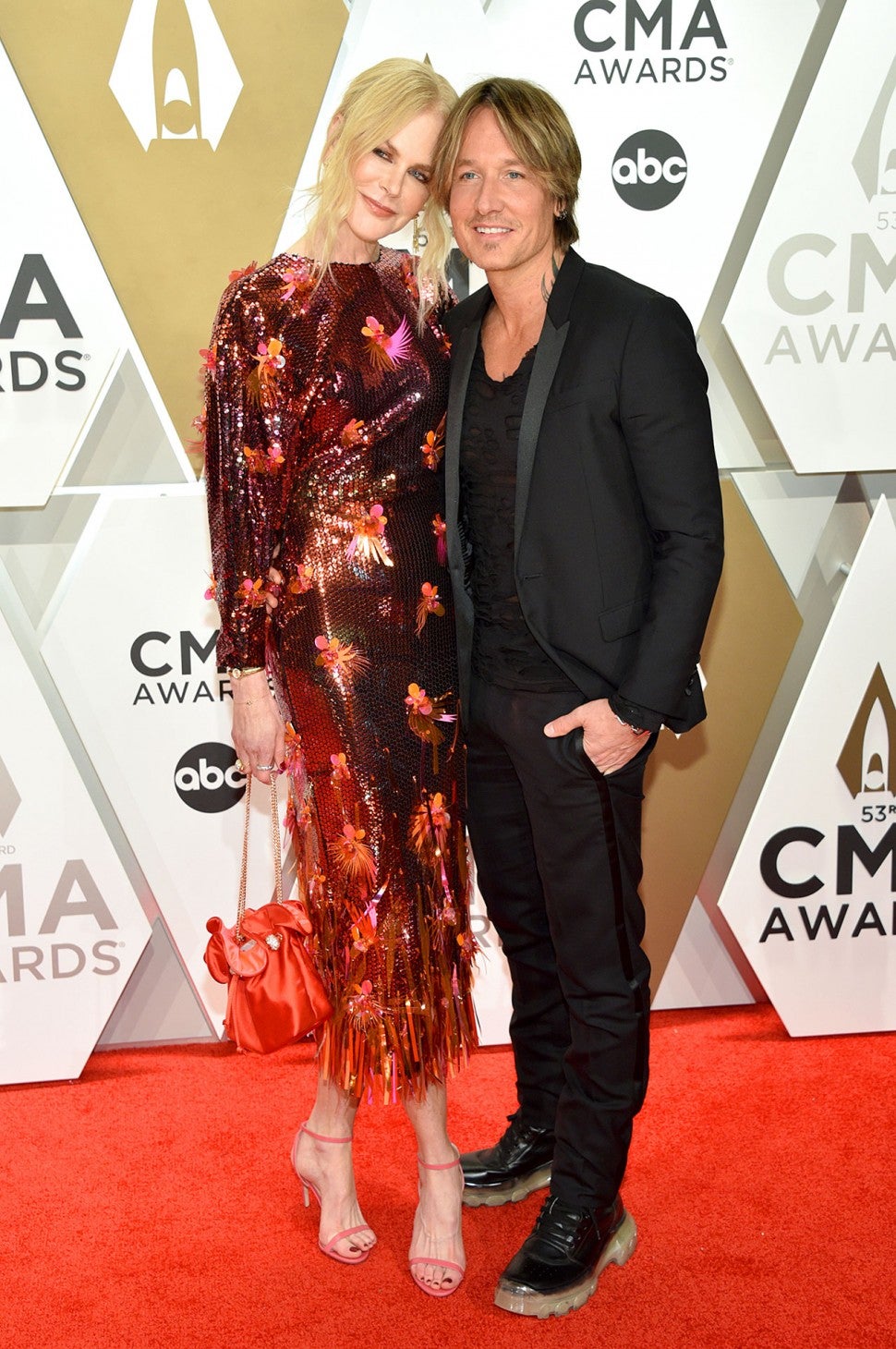 The lovebirds proved that they continue to be one of country music's hottest couples while arriving to the 53rd annual CMA Awards at the Music City Center in Nashville, Tennessee, on Wednesday night. The Big Little Lies looked glamorous in a sparkly orange and pink frock with floral decal and fringed ends. She paired the midi dress with single-strap pink heels and a coral Sophia Webster purse.