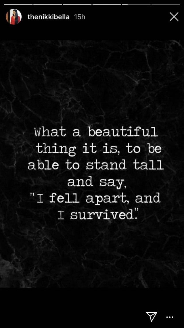 "What a beautiful thing it is, to be able to stand tall and say, 'I fell apart, and I survived,'" a second message, posted to her Story, said.