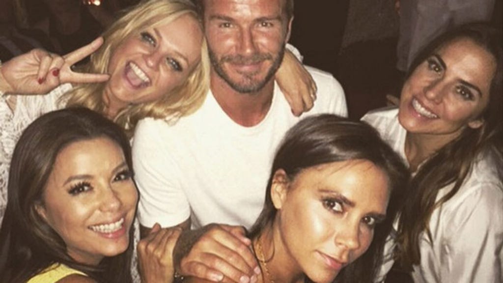 Among the many guests were Beckham's former Spice Girls bandmates Melanie Chisholm (a.k.a. Sporty Spice), Emma Bunton (a.k.a. Baby Spice), and Geri Halliwell (a.k.a. Ginger Spice), who all got close together -- along with actress Eva Longoria standing in for the absent Melanie Brown -- and snapped this awesome reunion pic.