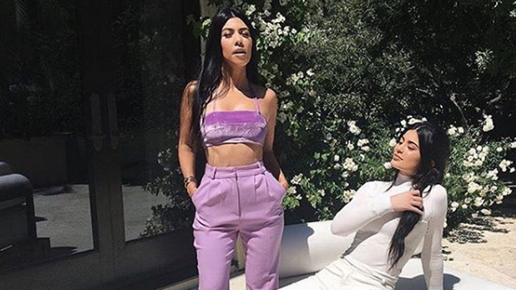 The 37-year-old mother of three hung out with her younger sister, Kylie Jenner, on Wednesday, and posed in a matching magenta top and high-waisted, wide-leg slacks. Kylie, 18, also kept to one one color with her outfit, donning an off-white turtleneck and slacks of the same shade. "Sunbathing with bae," Kourtney captioned a pic.