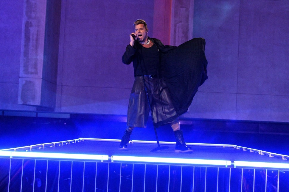 Martin brought an energetic performance on a massive stage platform outdoors. The pop star performed "Qué Rico Fuera" as a slew of lingerie-clad models surrounded the singer. Martin rocked a long, flowing satin robe, tank top, leather shorts and boots.