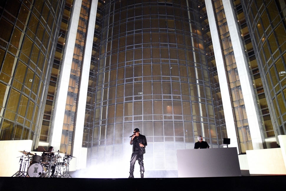 Hip-hop legend Nas performed his iconic song, "Hate Me Now," in a leather jacket and pant ensemble.