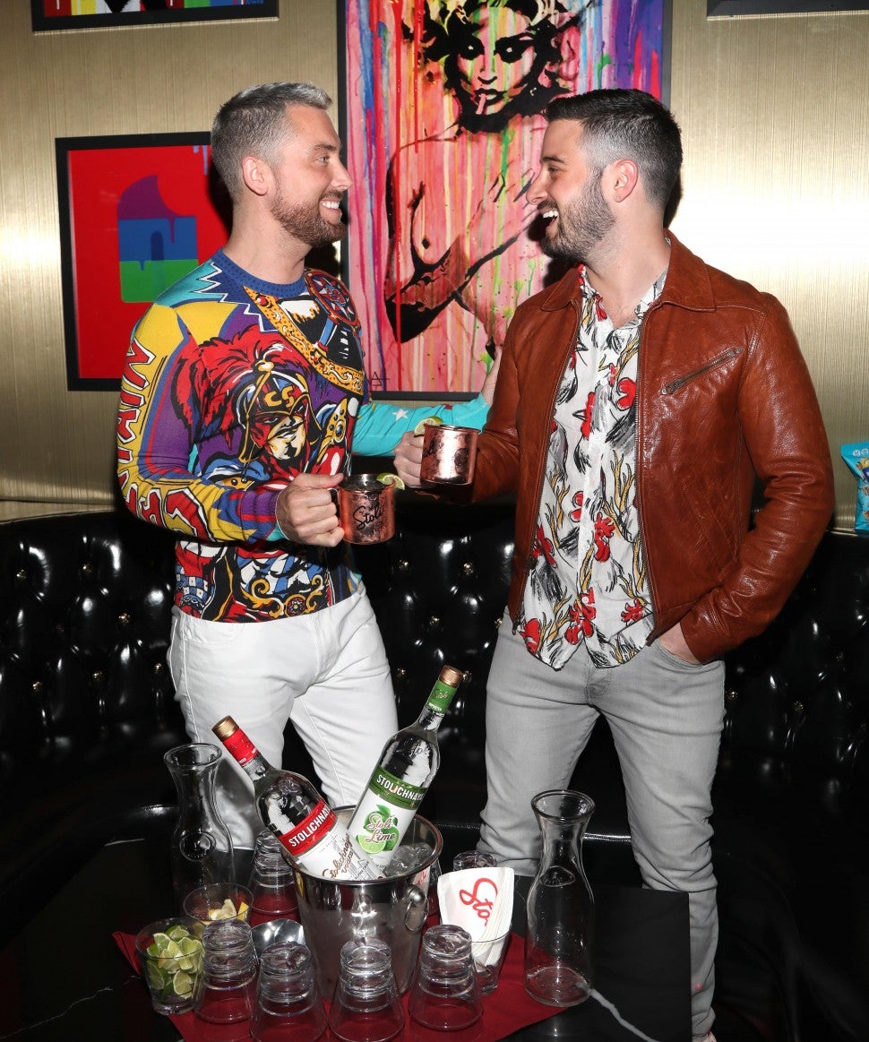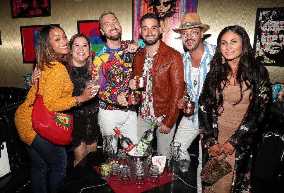 Wearing a colorful sweater and drinking out of a gold Moet vessel, the singer was joined by husband Michael Turchin, current boy band tourmates O-Town and Ryan Cabrera, longtime pal Lisa Vanderpump, 98 Degrees singer Jeff Timmons and *NSYNC bandmate JC Chasez, who also rocked bright colors via a floral jacket and orange baseball cap.