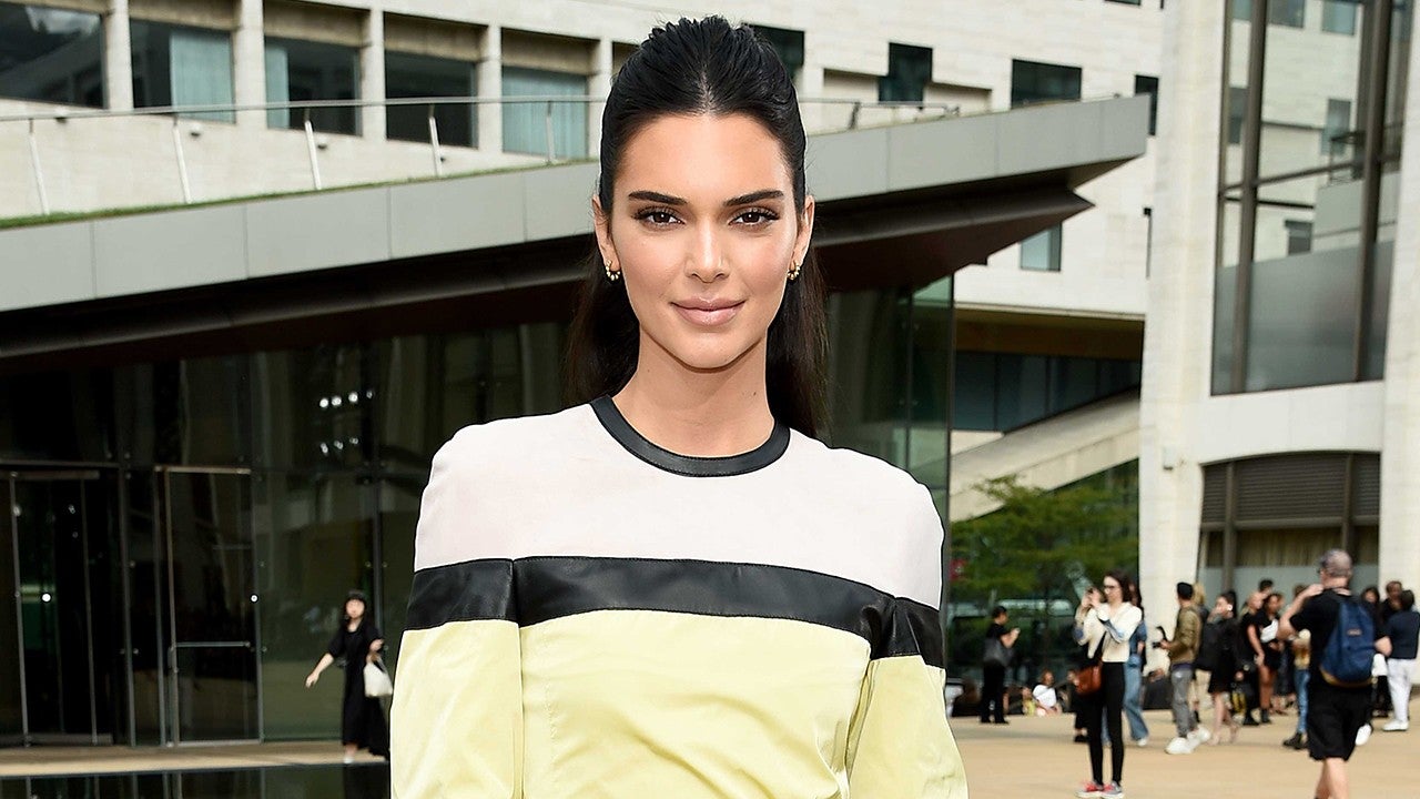 Kendall Jenner was chic in a multi-colored long-sleeve mini dress and mules at the Longchamp fashion show.