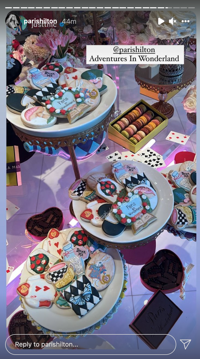 Hilton shared a few flicks of her own Saturday, showing off the teapot-shaped cake and Alice in Wonderland-themed treats at the aptly titled "Paris in Wonderland" bridal bash.